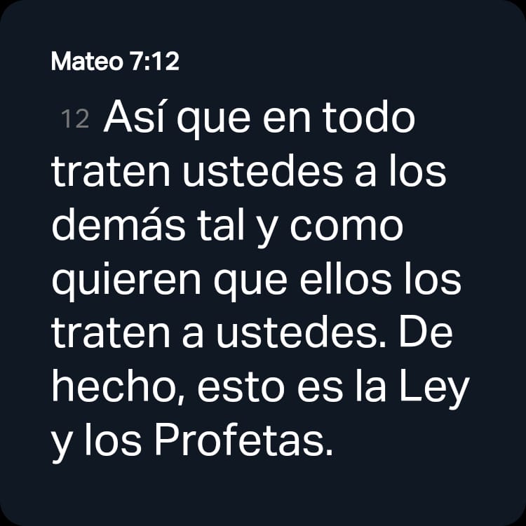 Un minuto con Dios Mateo 7:12 NVI [12] Así que en todo traten ustedes a los demás tal y como quieren que ellos los traten a ustedes. De hecho, esto es la Ley y los Profetas.https://bible.com/bible/128/mat.7.12.NVI