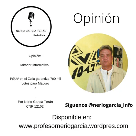 Mirador Informativo Opinión, Por Nerio García Terán CNP 12102PSUV en el Zulia garantiza 700 mil votos para MaduroSaludos cordiales mis estimados lectores y seguidores, deseando que hayan tenido una excelente semana.