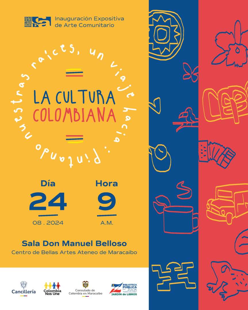 El Consulado General de Colombia en Maracaibo, la Biblioteca Pública del Estado Zulia “María Calcaño” y el Centro de Bellas Artes Ateneo de Maracaibo, invita a la inauguración de la exposición “Pintando Nuestras Raíces: Un Viaje hacia la Cultura Colombiana” en la sala Don Manuel Belloso, el 24 de agosto de 2024. Un proyecto dedicado a conectar a la población infantil colombiana que reside en Maracaibo, con la riqueza de su herencia cultural, a través del arte.
