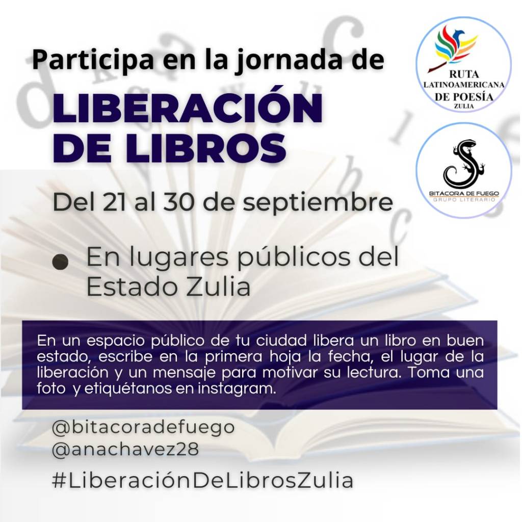 Los grupos literarios Ruta Latinoamericana de Poesía Zulia y Bitácora de Fuego te invitan a participar en la Jornada de Liberación de libros que realizaremos del 21 al 30 de septiembre en el territorio zuliano.