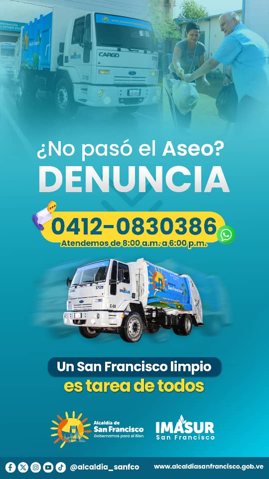 (San Francisco 8/10/2024) Para dar fiel cumplimiento a la recolección domiciliaria de desechos sólidos en distintos sectores del municipio, el alcalde Gustavo Fernandez, a través del Instituto Municipal de Ambiente y Aseo Urbano (Imasur), habilitó WhatsApp a través del 0412-0830386 para que los ciudadanos que no tengan acceso a las redes sociales puedan hacer sus reclamos a través de esta vía.