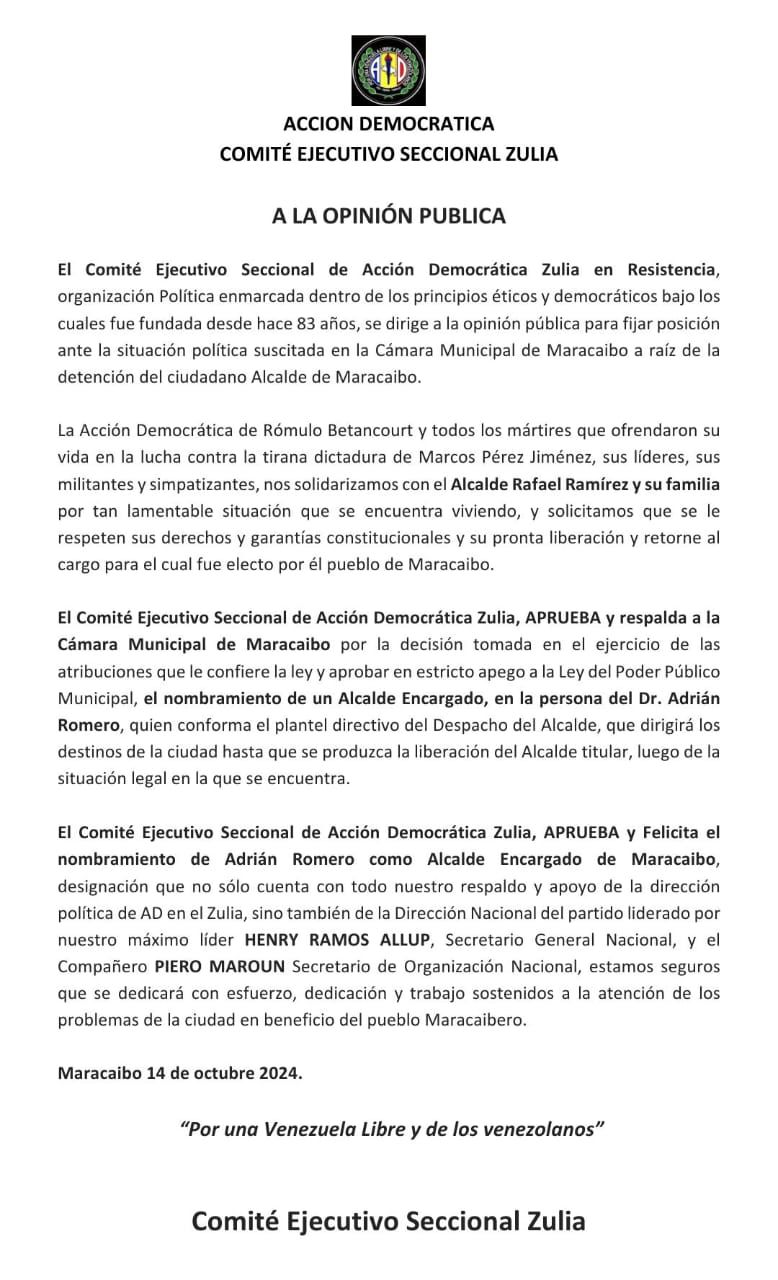 La Acción Democrática de Rómulo Betancourt y todos los mártires que ofrendaron su vida en la lucha contra la tirana dictadura de Marcos Pérez Jiménez, sus líderes, sus militantes y simpatizantes, nos solidarizamos con el Alcalde Rafael Ramírez y su familia por tan lamentable situación que se encuentra viviendo, y solicitamos que se le respeten sus derechos y garantías constitucionales y su pronta liberación y retorne al cargo para el cual fue electo por él pueblo de Maracaibo.