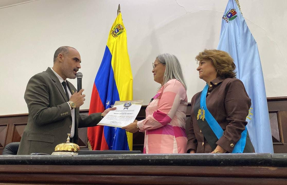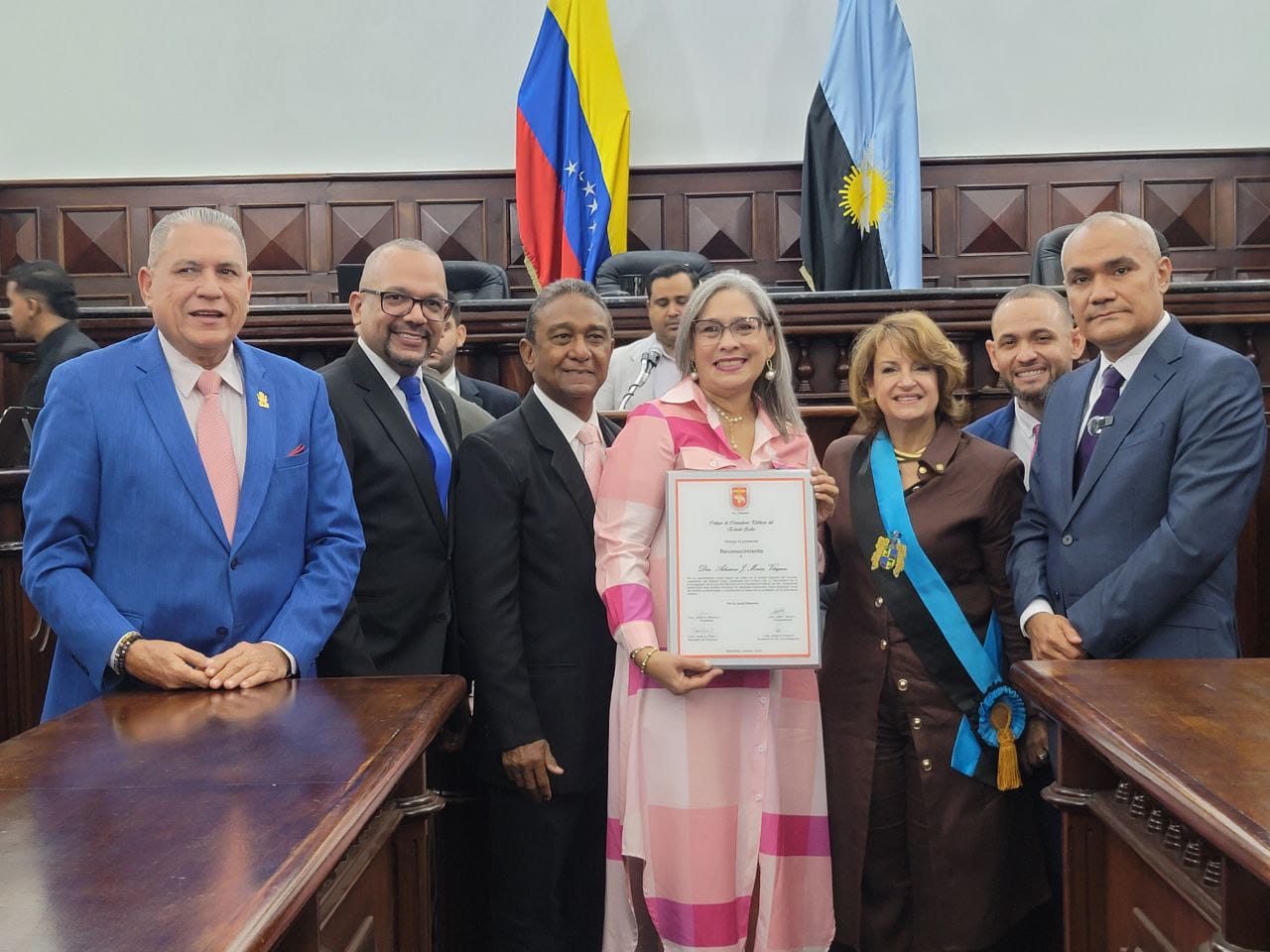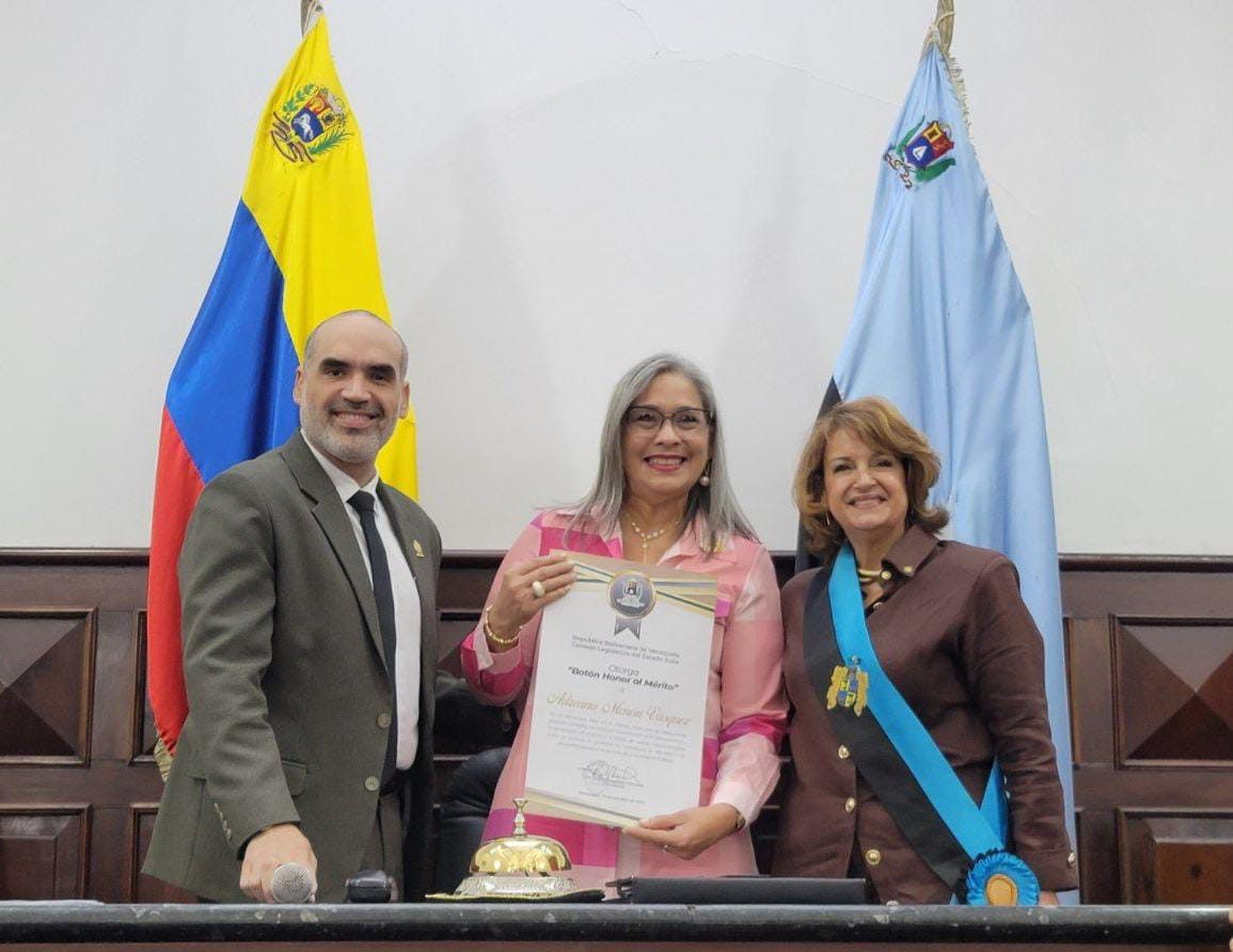 Durante la sesión, Adreana Morón, miembro del Comité Financiero del Instituto de Desarrollo Profesional del Colegio de Contadores Públicos del estado Zulia, fue reconocida con el Botón Honor al Mérito, por su destacada labor en el manejo financiero de instituciones públicas y privadas.