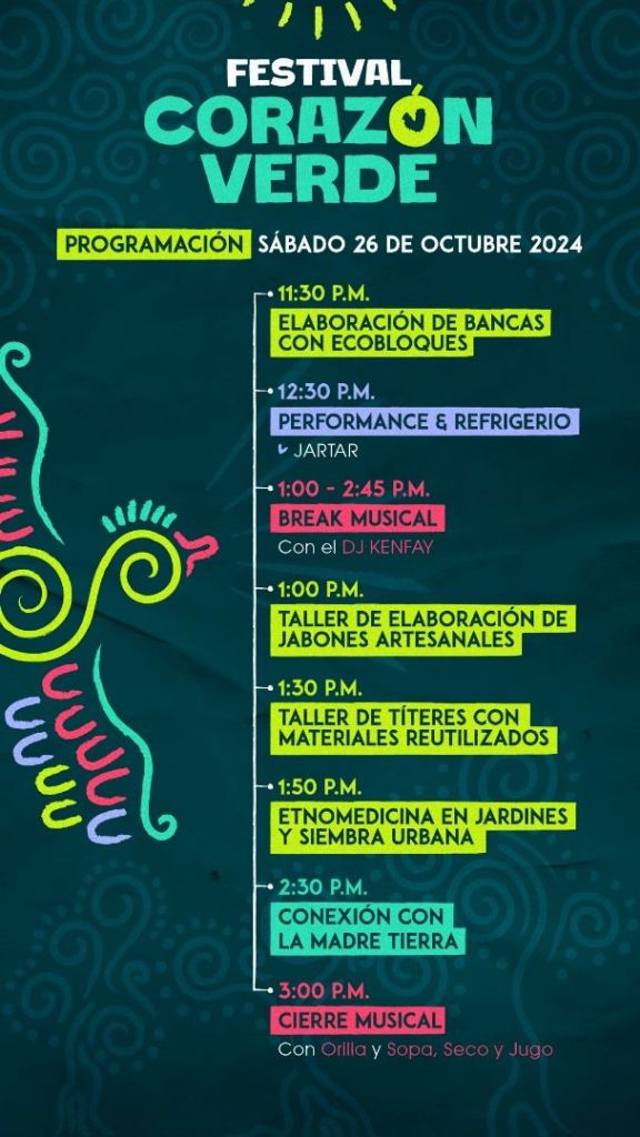 Al finalizar los talleres, a partir de las 12:30 p.m., se presentará el performance “Jartar” y se ofrecerá un refrigerio. Entre la 1:00 p.m. y las 2:45 p.m., los asistentes podrán disfrutar de la música del DJ Kenfay y participar en diversos talleres: elaboración de jabones artesanales (a cargo de El Zulia Recicla), creación de títeres con materiales reutilizados (organizado por el Taller de Arte Especial), etnomedicina en jardines y siembra urbana (con Casa Botánica) y conexión corporal con la Madre Tierra (con Épale Conéctate). El cierre del festival estará a cargo de los grupos musicales Orillas y Sopa, Seco y Jugo.