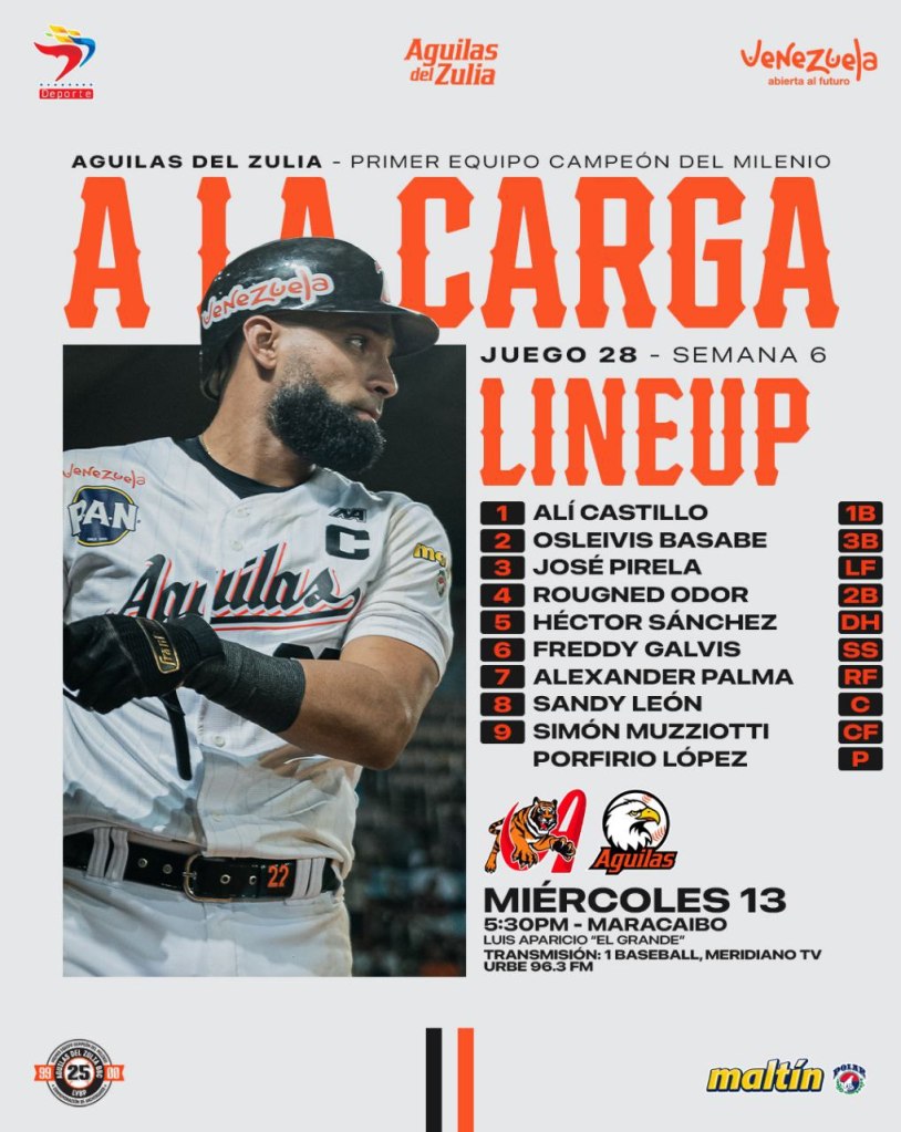 El Manager  de las Águilas del Zulia Lipson Nava anunció su line up, Ali Castillo Primera Base del Equipo será el bateador abridor, el segundo bateador será Oslebis Basabe, antesalista, y el tercer bate José Pirela LF.