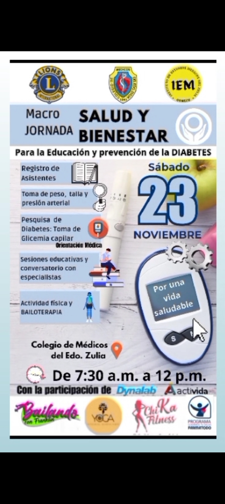 Los clubes de Leones invitan a la comunidad marabina para  asistir a la gran *Mega  Jornada SALUD Y BIENESTAR* en el mes Celeste  por la Educación y la Prevención de la Diabetes. Una mañana por la salud donde Usted como paciente diabético o familiar puede encontrar: