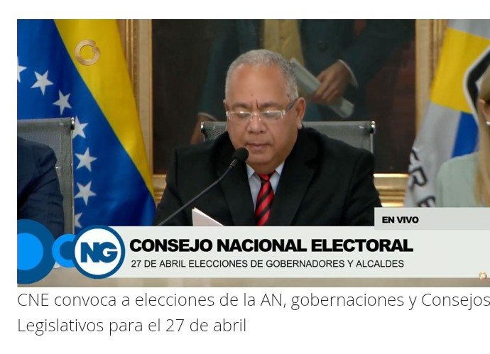 El presidente del Consejo Nacional Electoral (CNE), Elvis Amoroso, anunció que el próximo domingo 27 de abril se realizarán las elecciones integrales de los diputados de la Asamblea Nacional, gobernadores de estados del país y legisladores de los consejos legislativos de estado.