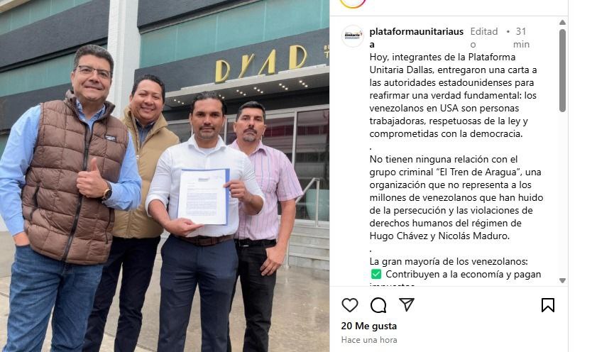 Integrantes de la Plataforma Unitaria Dallas, entregaron una carta a las autoridades estadounidenses para reafirmar una verdad fundamental: los venezolanos en USA son personas trabajadoras, respetuosas de la ley y comprometidas con la democracia..No tienen ninguna relación con el grupo criminal “El Tren de Aragua”, una organización que no representa a los millones de venezolanos … Continuar leyendo Venezolanos en el Exilio Entregaron Carta a Autoridades Estadounidenses