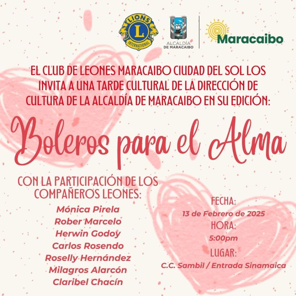 En el marco del Día del Amor y la Amistad este jueves 13 de febrero de 2025, El Club de Leones Maracaibo Ciudad del Sol te invita a disfrutar de un concierto de boleros.