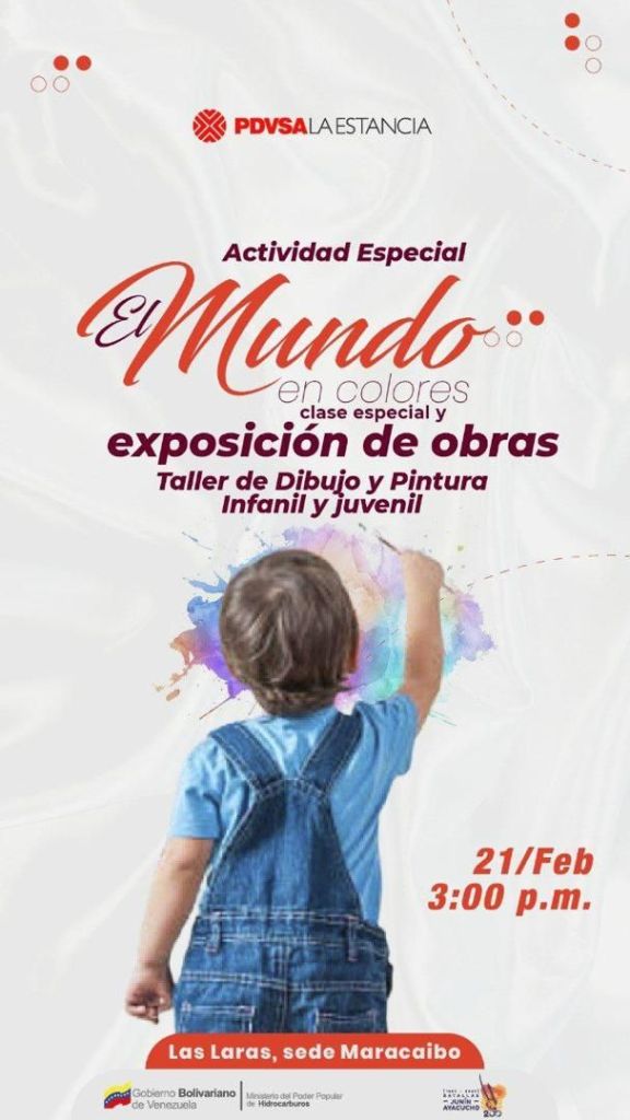 Niños y jóvenes alumnos del Taller de Dibujo y Pintura que ofrece PDVSA La Estancia Maracaibo, a cargo de la formadora Marisol Colina, presentarán la actividad especial “El Mundo en Colores”, este viernes 21 de febrero, a las 4:00 de la tarde en los espacios del Edificio Las Laras.