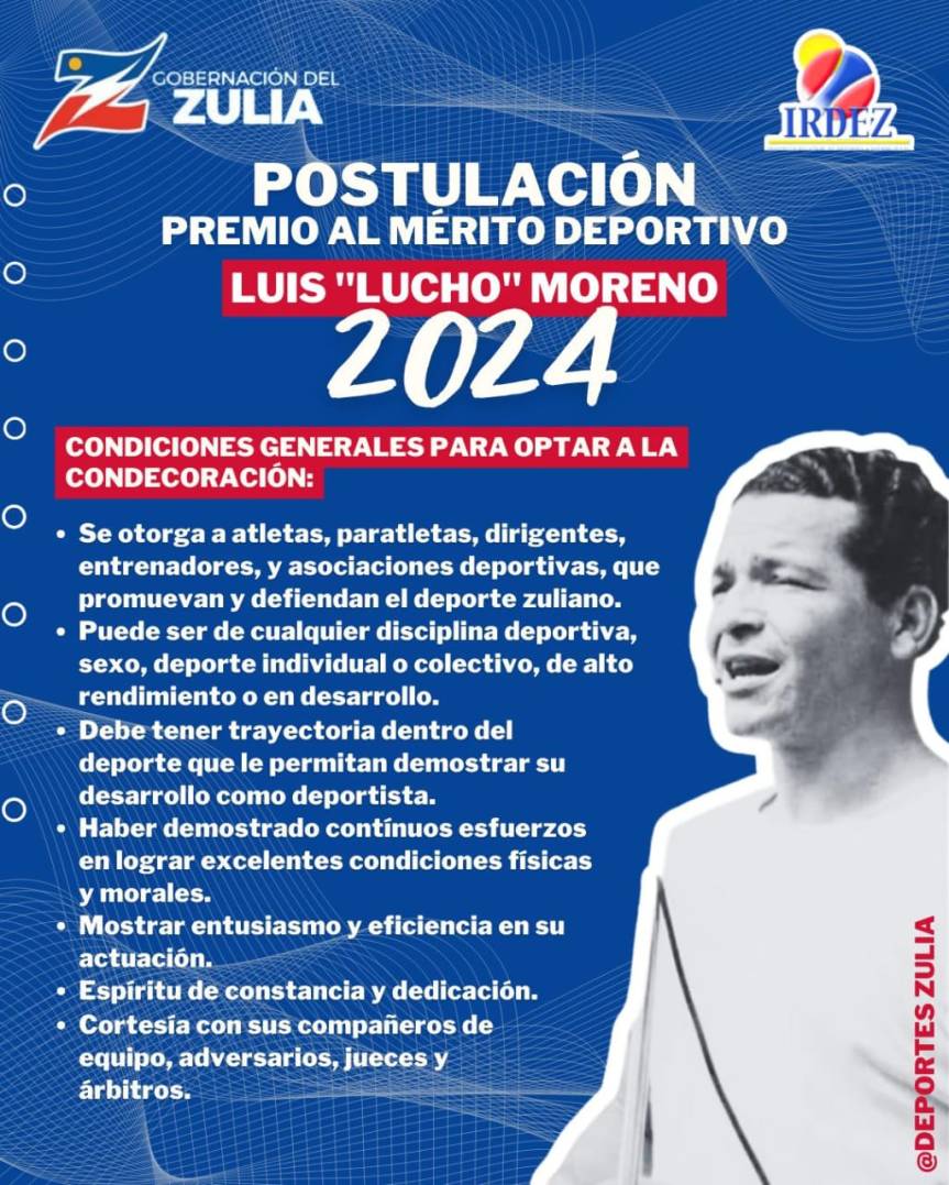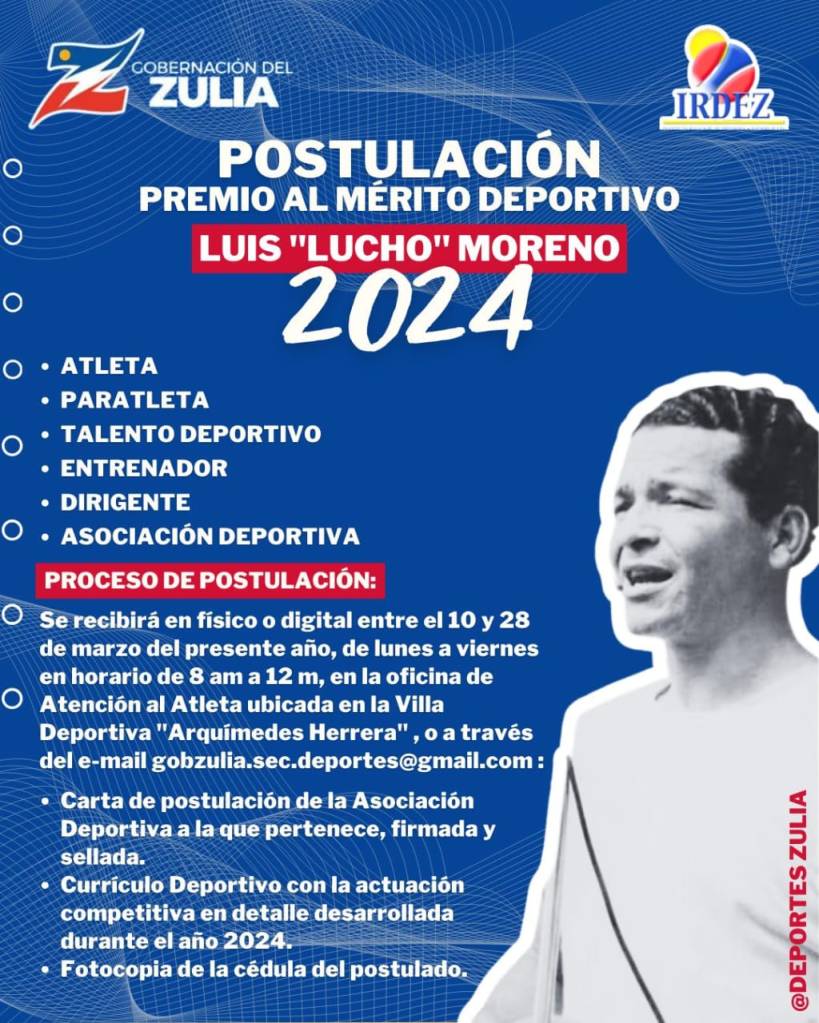 A partir de este 10 de marzo hasta el 28 del mismo la comunidad deportiva regional está en la oportunidad de formalizar la opción para ser reconocido con el máximo galardón deportivo que se otorga en el Zulia como lo es el Premio Luis «Lucho» Moreno.