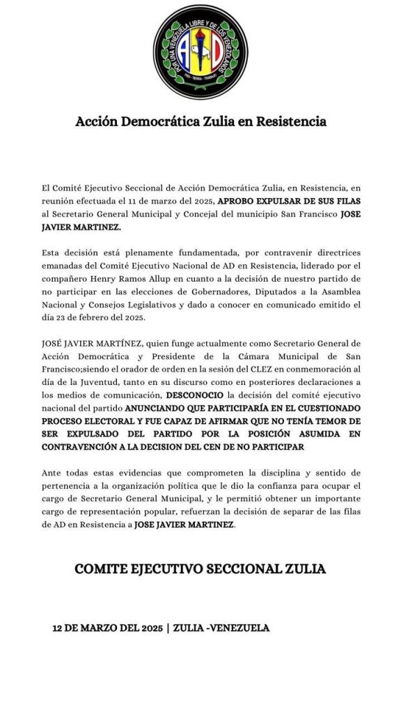 Ante este acto de indisciplina, la mayoría calificada del Comité Ejecutivo Seccional de AD-Zulia decidió, el 11 de marzo de 2025, expulsarlo de la organización y, en consecuencia, destituirlo de su cargo como Secretario General de AD en Resistencia en el municipio San Francisco.