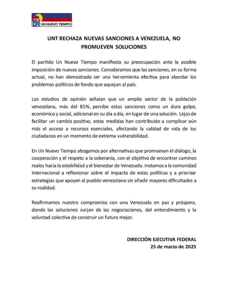 El partido Un Nuevo Tiempo manifiesta su preocupación ante la posible imposición de nuevas sanciones. Consideramos que las sanciones, en su forma actual, no han demostrado ser una herramienta efectiva para abordar los problemas políticos de fondo que aquejan al país.