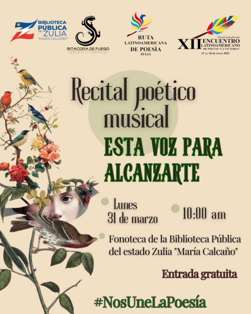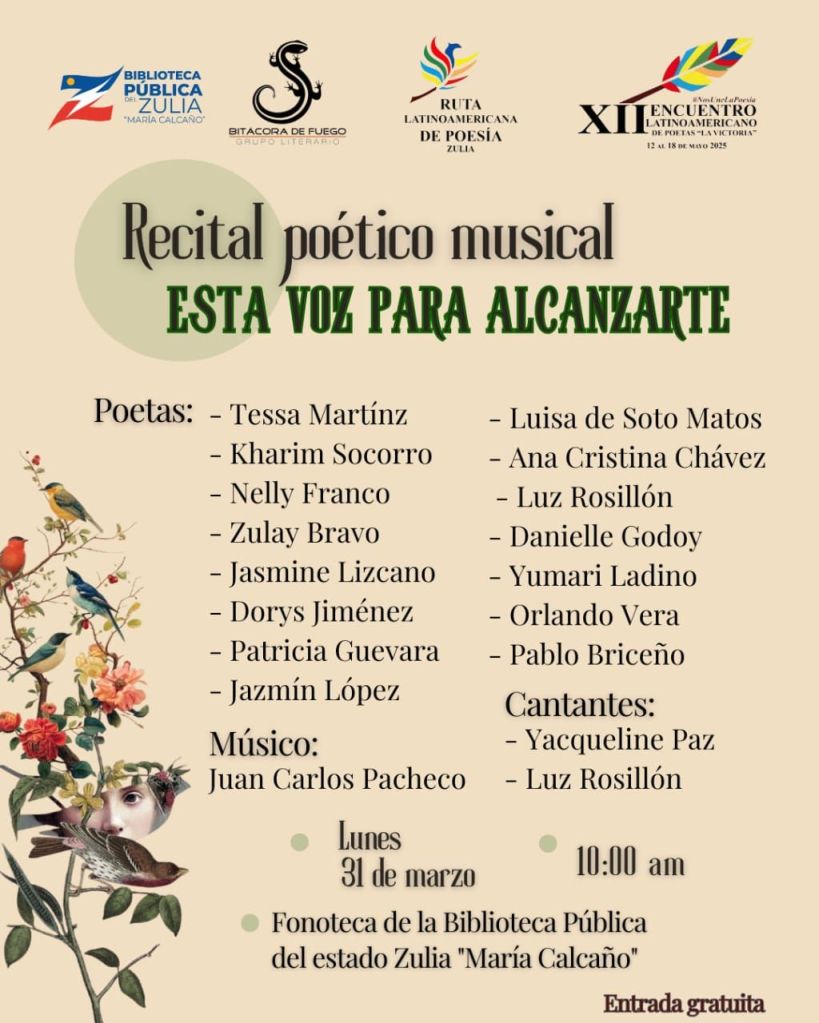 La entrada es gratuita, te invitan la Ruta latinoamericana de poesía Zulia, el grupo literario Bitácora de Fuego y la Fonoteca de la Biblioteca Pública del estado. ¡Te esperamos!