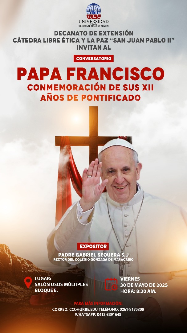 Invitación al Conversatorio Legado del Papa Francisco: Doce años de su Pontificado «. Viernes 30 de mayo de 2025 hora. 8.30am. Bloque E.