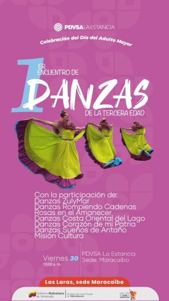 El Día del Adulto Mayor tendrá su celebración en PDVSA La Estancia Maracaibo este viernes 30 de mayo a partir de las 10:00 de la mañana con el 1er Encuentro de Danzas del Adulto Mayor, que contará con la participación de 7 agrupaciones de la región zuliana.
