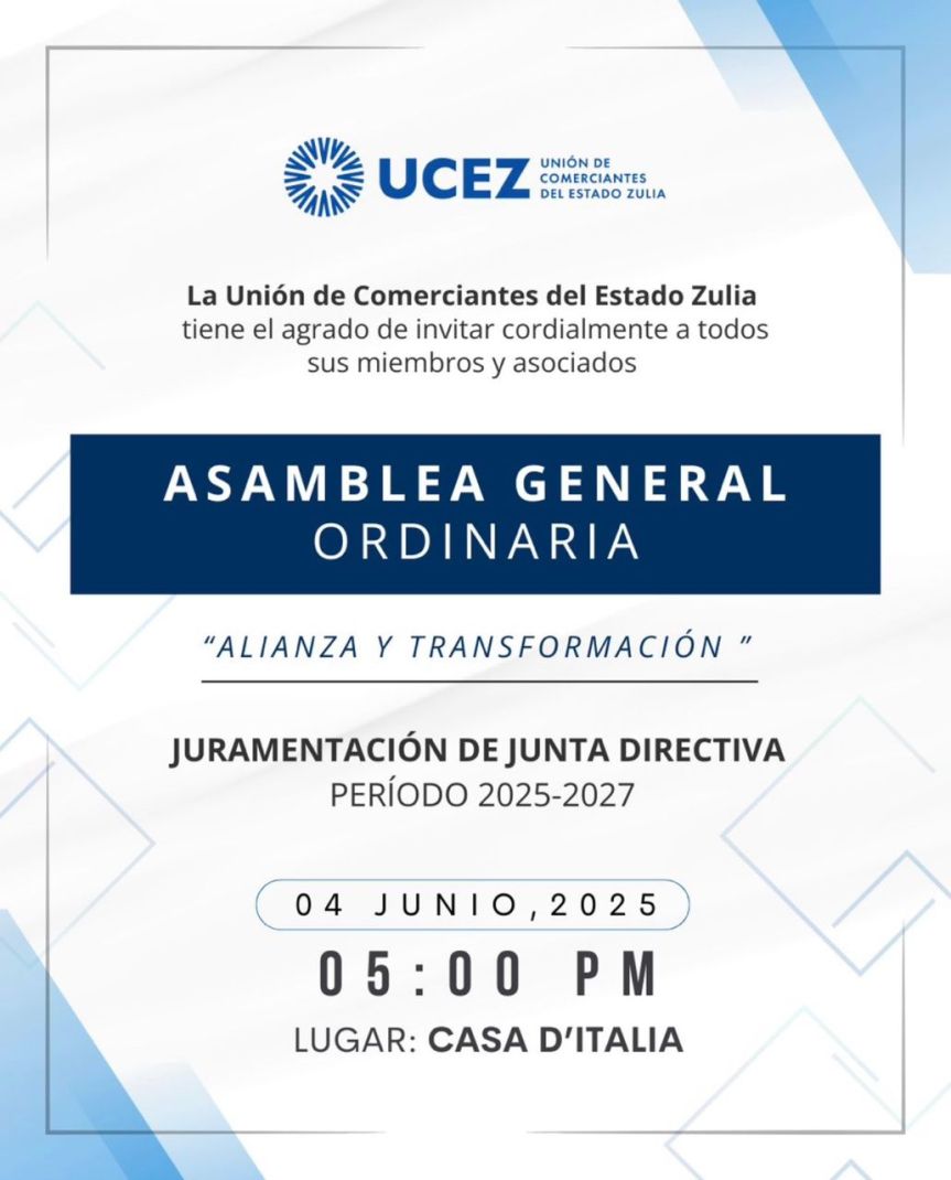 La Unión de Comerciantes del Estado Zulia, convoca para hoy miércoles 04 de junio, a la Asamblea Ordinaria, con motivo de la juramentación de la nueva directiva periodo 2025 2027.