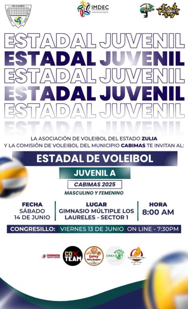 El próximo sábado 14 de junio, se realizará en el Municipio Cabimas, Gimnasio de Usos Múltiples de la Urbanización los Laureles, el Campeonato Estatal de Voleibol Categoría Juvenil,  Con la participación de 8 municipios, evento organizado por la Asociación de Voleibol del Estado Zulia.