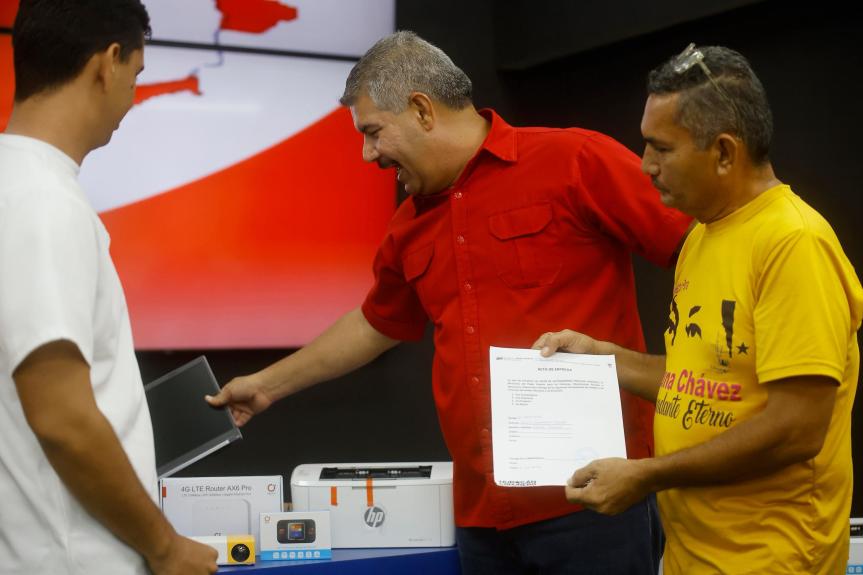 El acto estuvo encabezado por el ministro para las Comunas, Movimientos Sociales y Agricultura Urbana, Ángel Prado, y el gobernador bolivariano del Zulia, Ing. Luis Caldera, quien destacó que la dotación comprende 331 kits conformado cada uno de ellos por computadora, proyector, router, impresora, sillas y mesas.