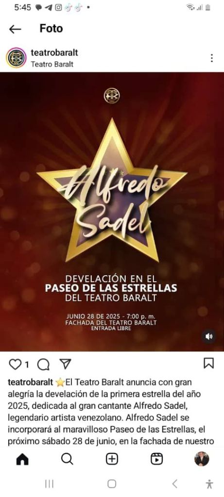 ‎En El icónico Teatro Baralt de Maracaibo develaran la estrella de Alfredo Sadel, uno de los cantantes más queridos y recordados de la ciudad.