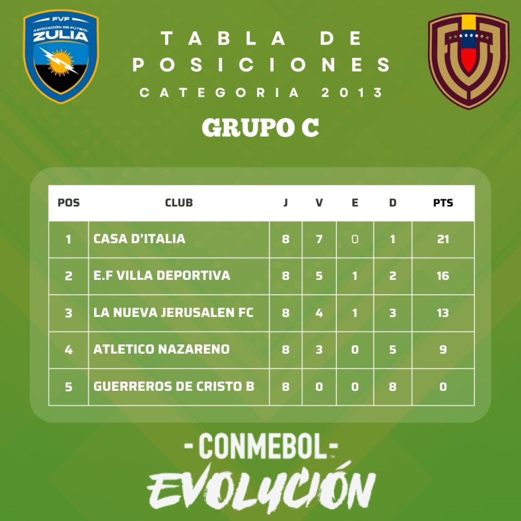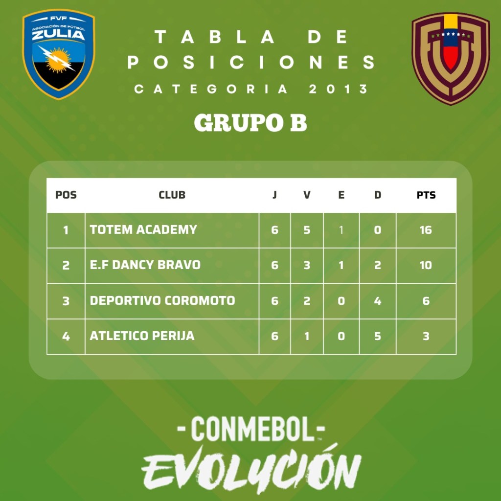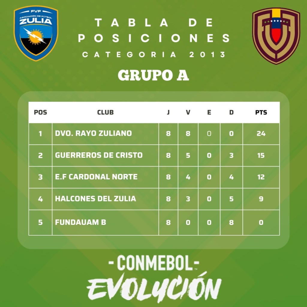 La Copa Conmebol Evolutión sigue desarrollándose en la categoría Sub 13, La Asociación de Futbol del Estado Zulia envió, la clasificación de los grupos que se encuentra de la siguiente manera.