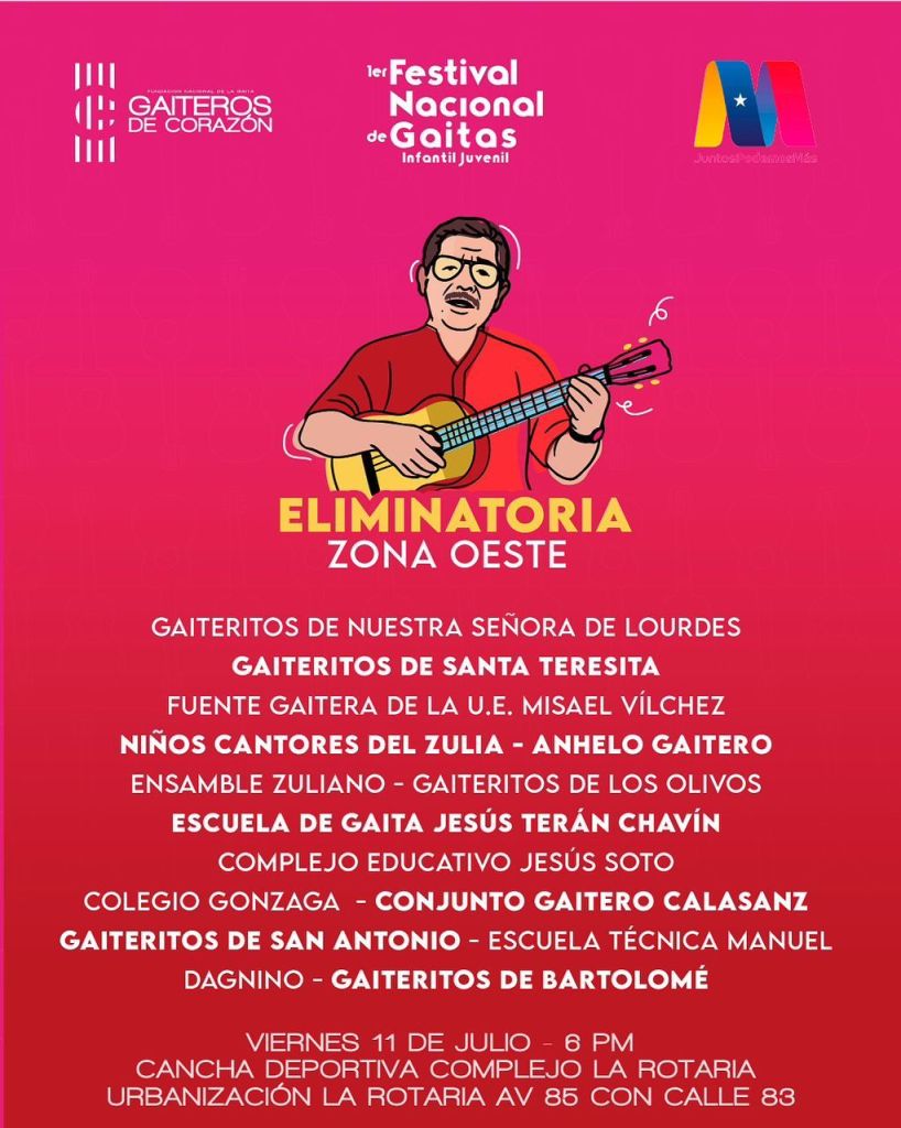 La vibrante emoción del 1er Festival Nacional de Gaitas Infantil Juvenil en homenaje al Parroquiano, Astolfo Romero, organizado por la Fundación Nacional de la Gaita Gaiteros de Corazón, llega este viernes 11 de julio a la zona oeste de Maracaibo. Tras exitosas jornadas en el este, norte y la Costa Oriental del Lago, la comunidad de La Rotaria será el epicentro de la cuarta eliminatoria de este gran evento musical.