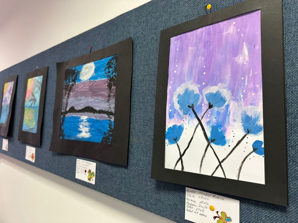 Niñas y niños entre 8 y 12 años exhibieron algunas de sus obras en materia de pintura, dibujo y también en escritura, como muestra de los talentos y el aprendizaje adquirido durante el desarrollo de los talleres.