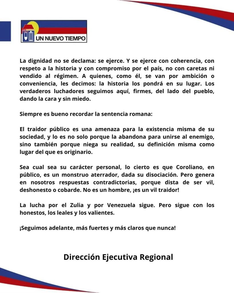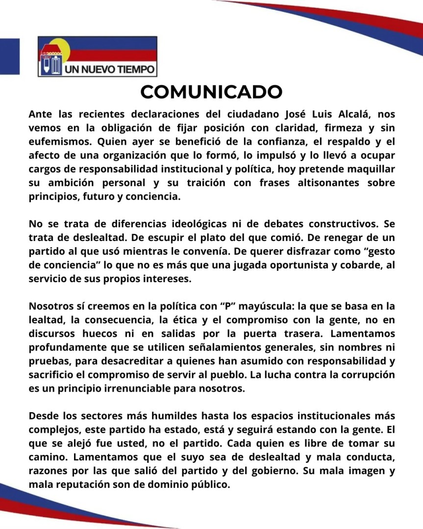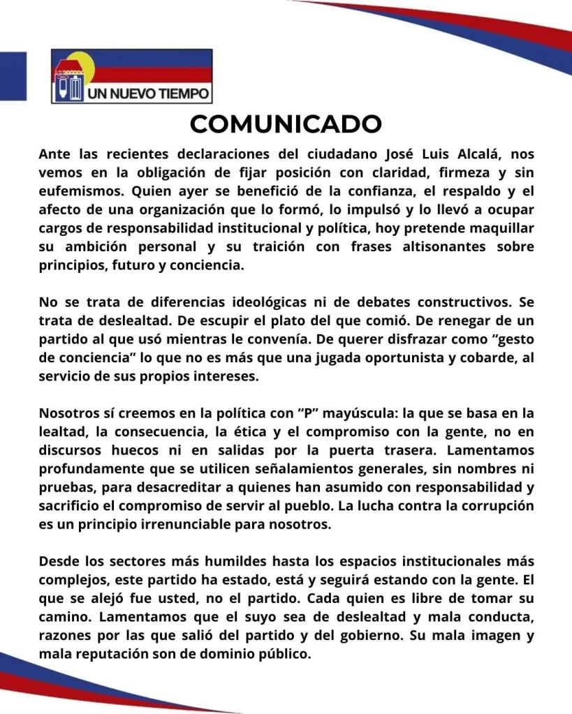 En un Comunicado a la opinión pública, la dirección regional del partido Un Nuevo Tiempo,  respondió a los señalamientos de su exdirigente regional José Luis Alcala.