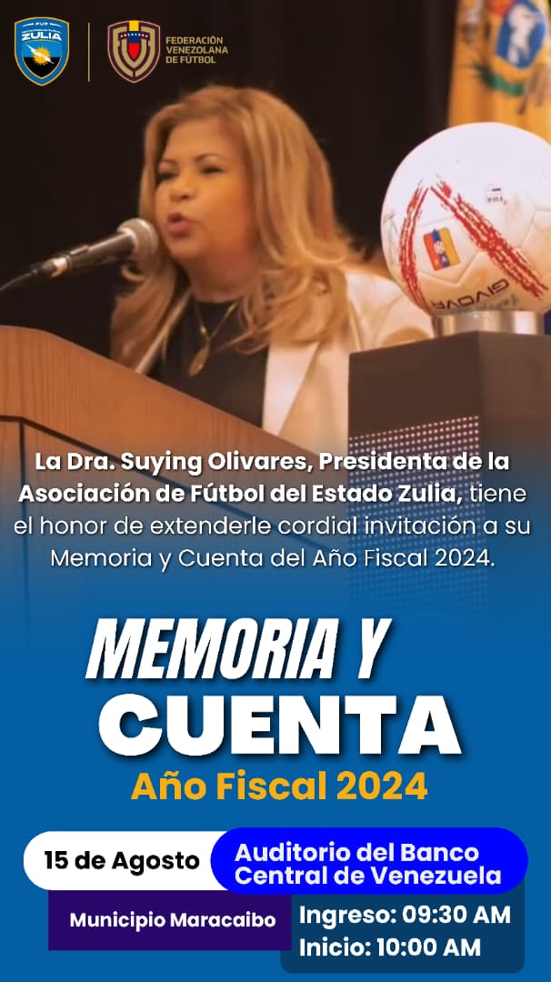 La Junta Directiva de la Asociación de Fútbol del Estado Zulia, convoca a todos los clubes afiliados, a la Asamblea General de Presentación de Memoria y Cuenta, del año fiscal 2024 este viernes 15 de agosto.