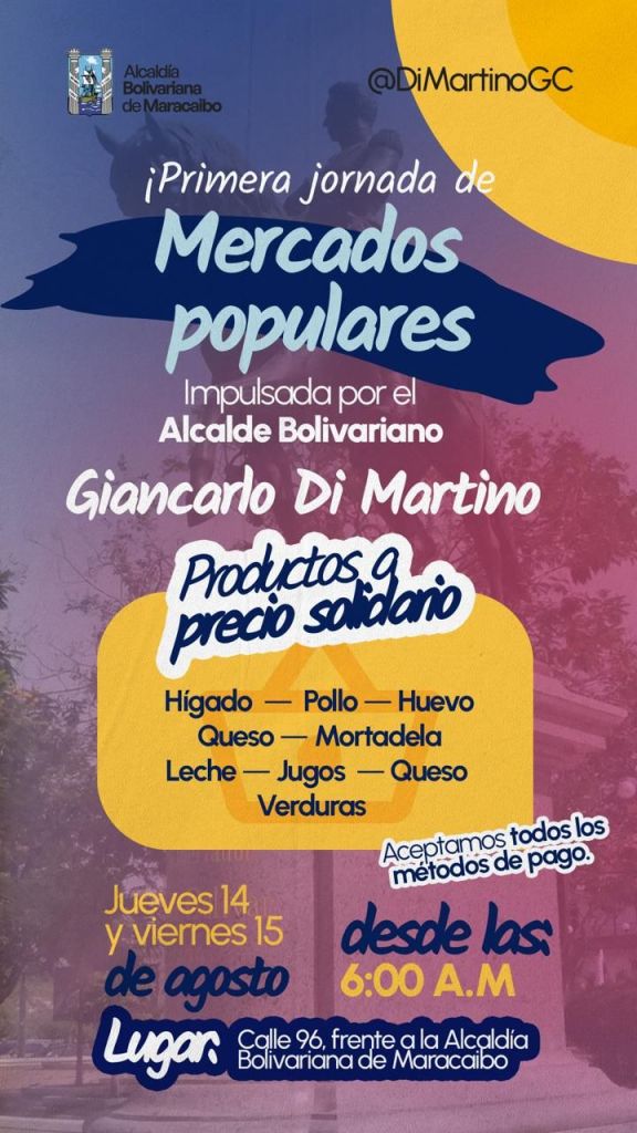 Como parte de las acciones de gobierno que viene impulsando el alcalde bolivariano de Maracaibo, Giancarlo Di Martino, se realizará durante los dias jueves 14 y viernes 15 de agosto, la primera jornada de mercados populares para beneficio de los marabinos.