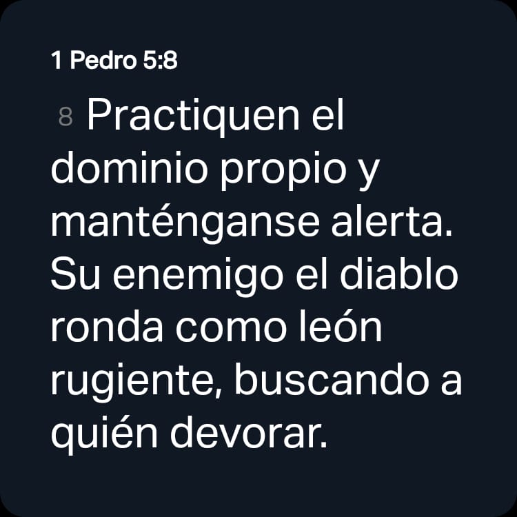 [8] Practiquen el dominio propio y manténganse alerta. Su enemigo el diablo ronda como león rugiente, buscando a quién devorar.