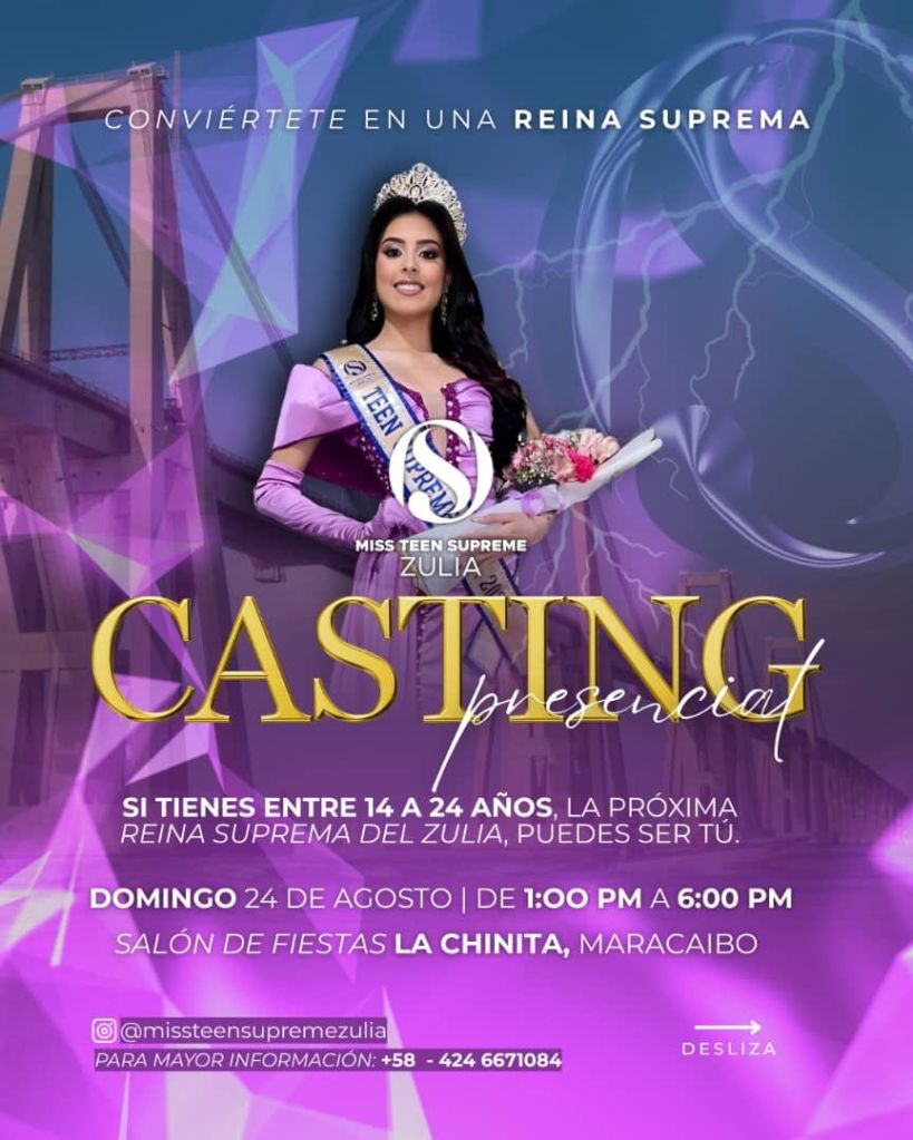 ¿Sueñas con pisar una pasarela? ¿Con representar al Zulia con elegancia y carisma? Esta es tu owuosrtuvyportunidad de brillar. La organización Miss y Teen Supreme Zulia abre su casting 2025