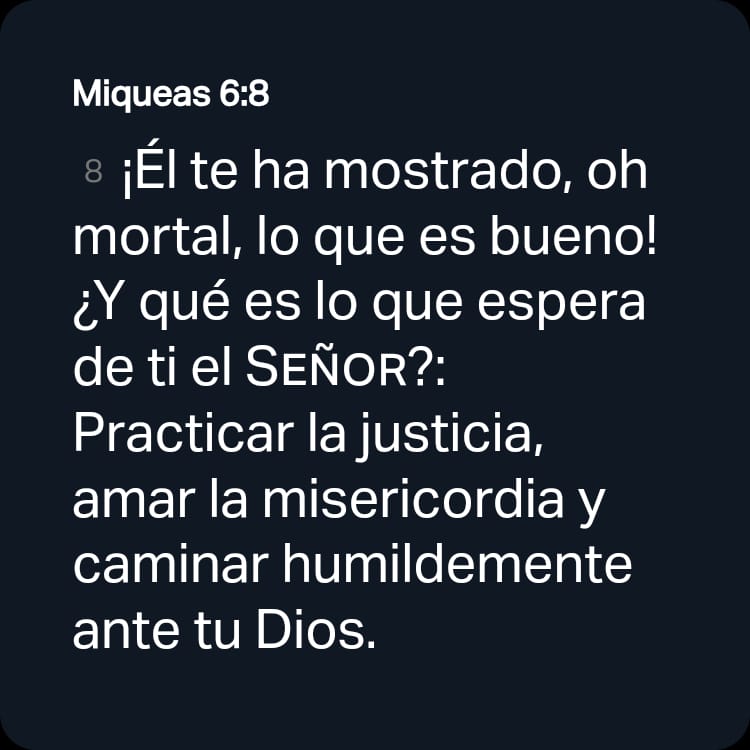 [8] ¡Él te ha mostrado, oh mortal, lo que es bueno! ¿Y qué es lo que espera de ti el Señor?: Practicar la justicia, amar la misericordia y caminar humildemente ante tu Dios.