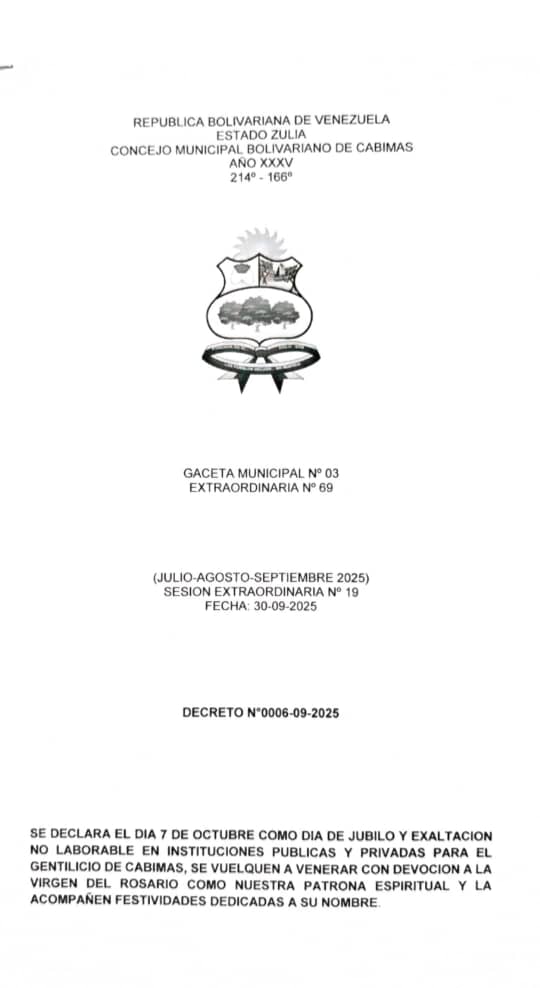Considerando que es deber del Poder Ejecutivo Municipal dictar medidas que tiendan a exaltar los valores relacionados con la cultura del municipio Cabimas, alcalde bolivariano, Dr. Frank Carreño, bajo el Decreto Municipal N° 0006-09-2025, declara que el 07 de octubre será no laborable en instituciones públicas y privadas, por ser el día de Nuestra Señora del Rosario, patrona del municipio Cabimas.