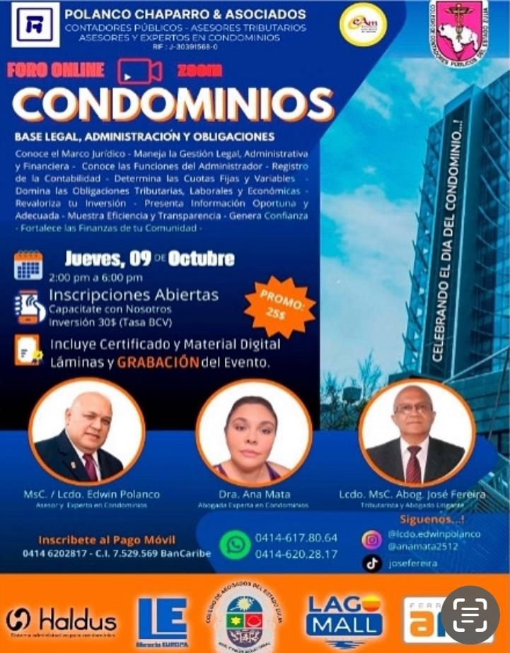 La Firma Polanco, Chaparro & Asociados Organiza para este 09 de Octubre el Foro Online Sobre Condominios, Base Legal, Administración y Obligaciones, Vía. Zoom más información en los flayer que compartimos.