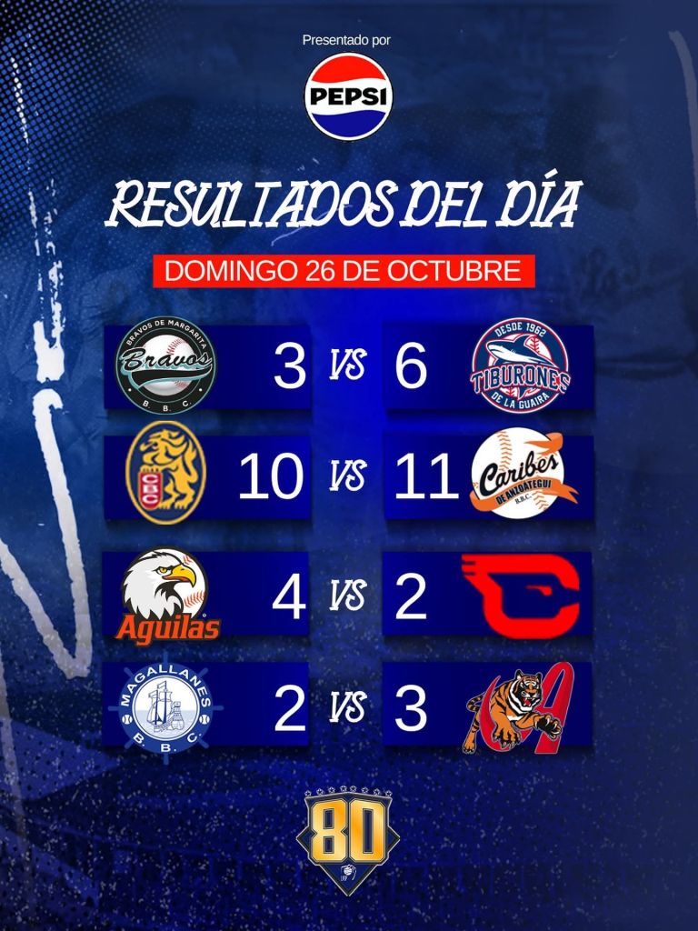 Resultados y Tabla de posiciones LVBP Jornada del Martes 28 de octubre Caracas vs Aragua Magallanes vs Anzoátegui Margarita vs La Guaira Zulia vs Lara Comparte esto: Haz clic para compartir en X (Se abre en una ventana nueva) X Haz clic para compartir en Facebook (Se abre en una ventana nueva) Facebook Me gusta Cargando... Relacionado