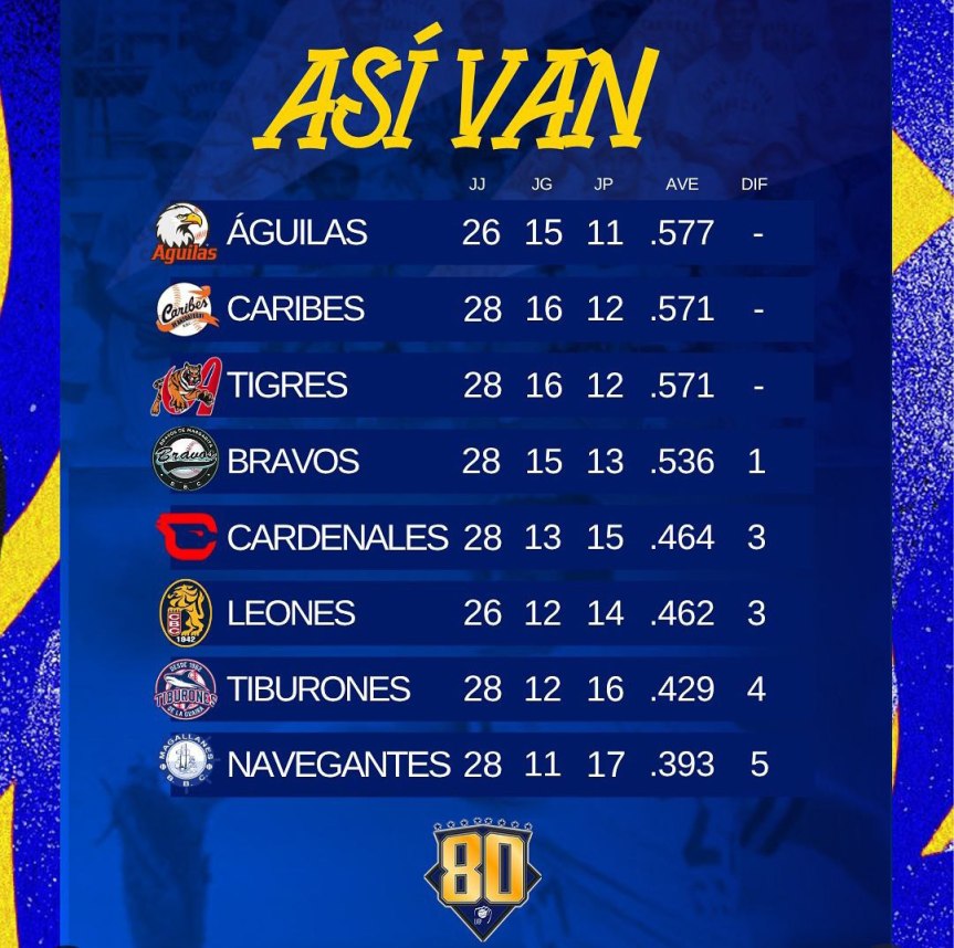 Resultados y Posiciones de la Liga Venezolana de Beisbol Profesional Resultados y Posiciones de la Liga Venezolana de Beisbol Profesional Comparte esto: Compartir en X (Se abre en una ventana nueva) X Comparte en Facebook (Se abre en una ventana nueva) Facebook Me gusta Cargando... Relacionado