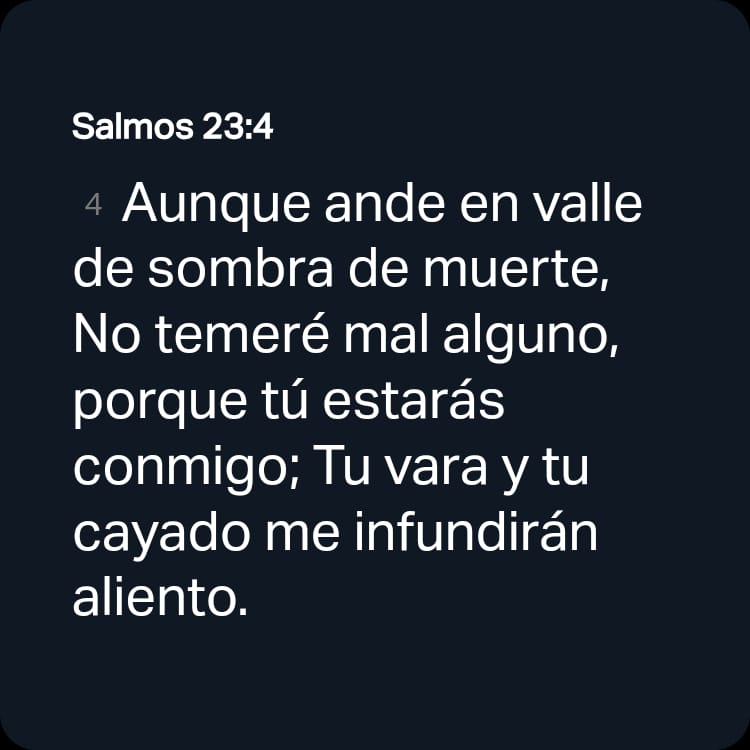 [4] Aunque ande en valle de sombra de muerte, No temeré mal alguno, porque tú estarás conmigo; Tu vara y tu cayado me infundirán aliento.