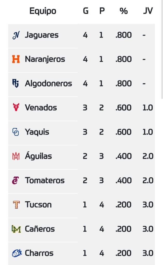 Posiciones en las 5 Ligas mas importantes de la pelota invernal