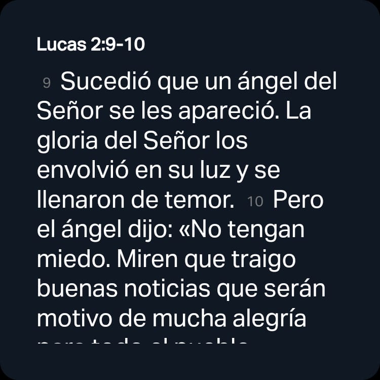 [9] Sucedió que un ángel del Señor se les apareció. La gloria del Señor los envolvió en su luz y se llenaron de temor. [10] Pero el ángel dijo: «No tengan miedo. Miren que traigo buenas noticias que serán motivo de mucha alegría para todo el pueblo.