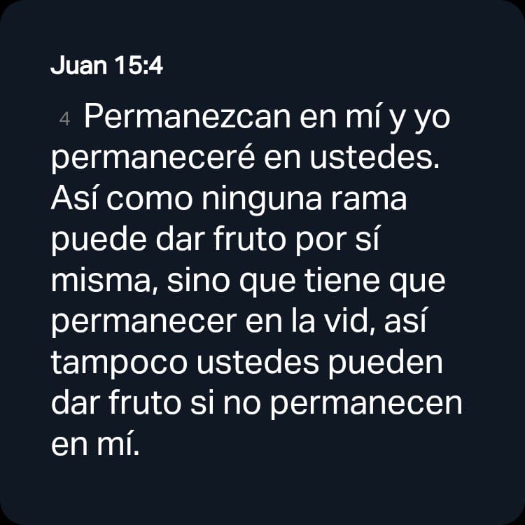 [4] Permanezcan en mí y yo permaneceré en ustedes. Así como ninguna rama puede dar fruto por sí misma, sino que tiene que permanecer en la vid, así tampoco ustedes pueden dar fruto si no permanecen en mí.