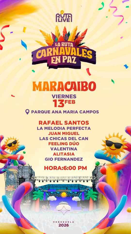 *(Maracaibo, 12 de Febrero de 2026)* Artistas nacionales e internacionales animarán este viernes 13, la Ruta de Carnavales en paz en el Parque Monumental Ana María Campos, organizado por la Alcaldía Bolivariana de Maracaibo para el disfrute de la familia marabina.