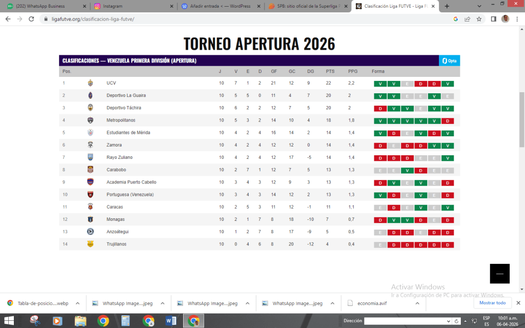 Tabla de Posiciones Liga Futve