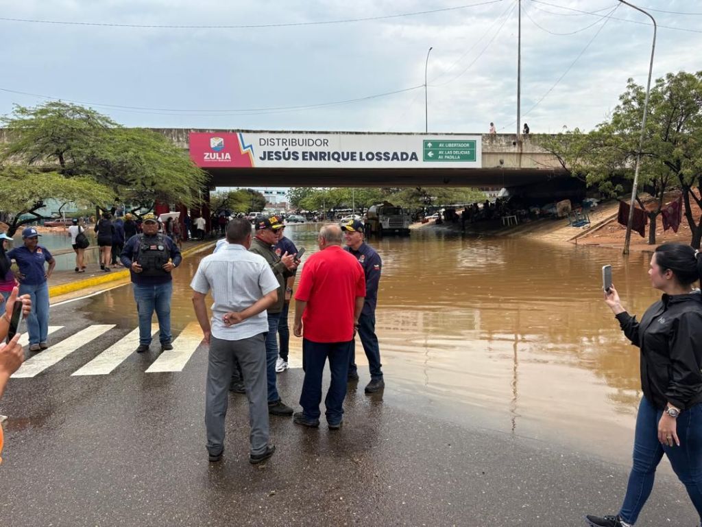 *(Maracaibo, 25 de abril de 2026.- Una respuesta inmediata dio la Alcaldía Bolivariana de Maracaibo ante las cuatro horas de lluvia, aproximadamente, que sorprendieron a los marabinos este sábado 25 de abril. Los funcionarios del Instituto Municipal del Ambiente (IMA) —dependencia del ayuntamiento—, Seguridad Ciudadana, Bomberos y Protección Civil iniciaron la atención en los sectores afectados. Procedieron a verificar el cauce de las cañadas principales y sus ramales siguiendo las instrucciones del alcalde Giancarlo Di Martino, quien estuvo al frente de las inspecciones en los puntos más complicados, entre ellos el distribuidor Jesús Enrique Lossada, en el casco central de la ciudad.